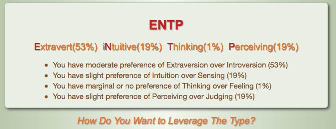 In the personality test I took I got ENTP. That stands for Extravert, iNtuitive, thinking, and Percieving. My personality type tends to take lead of the project and lead the group. This is why ENTP people usually don't work to well in a group because they would both try and take lead of the group.